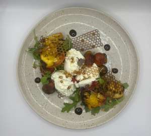 Jasmine tea panna cotta|Grilled peaches|Cinnamon